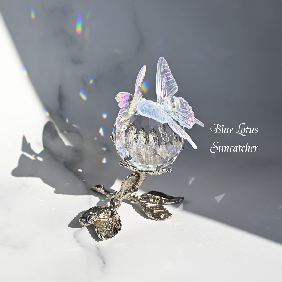 クリスタルガラスの上部に取り付けられたアクリル製の大小の蝶々がアクセントになっています。