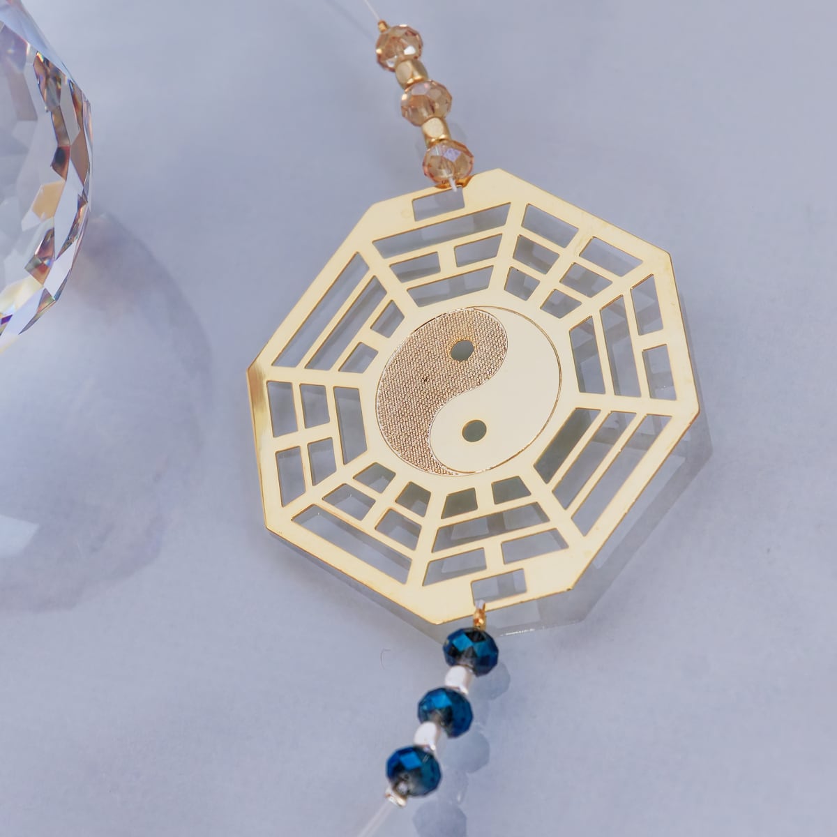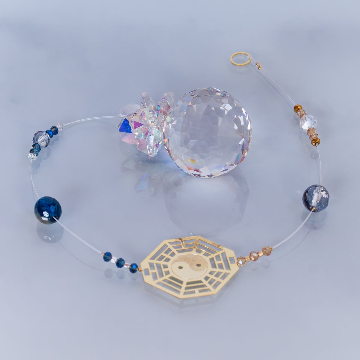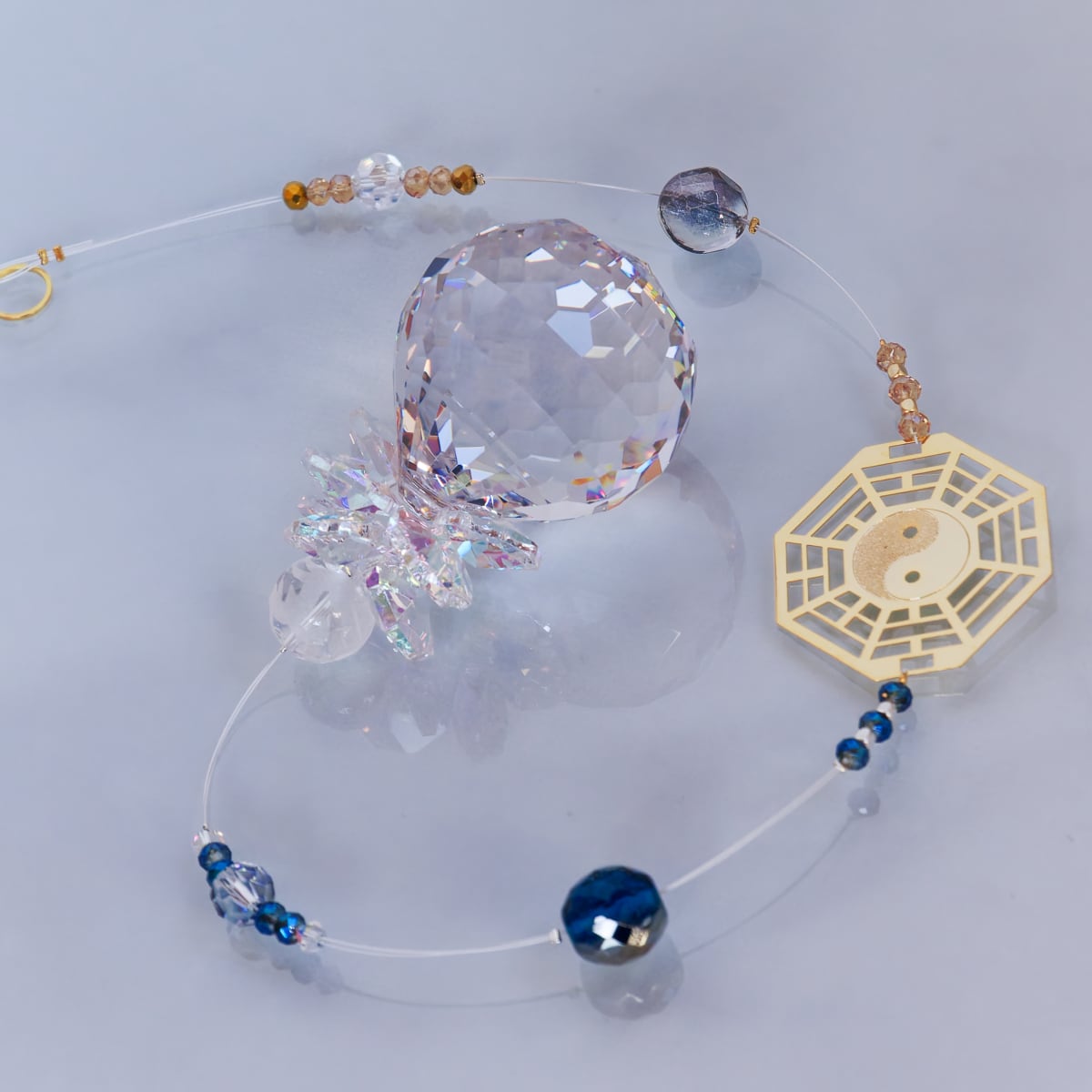 太極図が描かれた真鍮製の八卦型パーツを中央に配置し、陰と陽の調和が取れた世界観をサンキャッチャーで表現してみました。