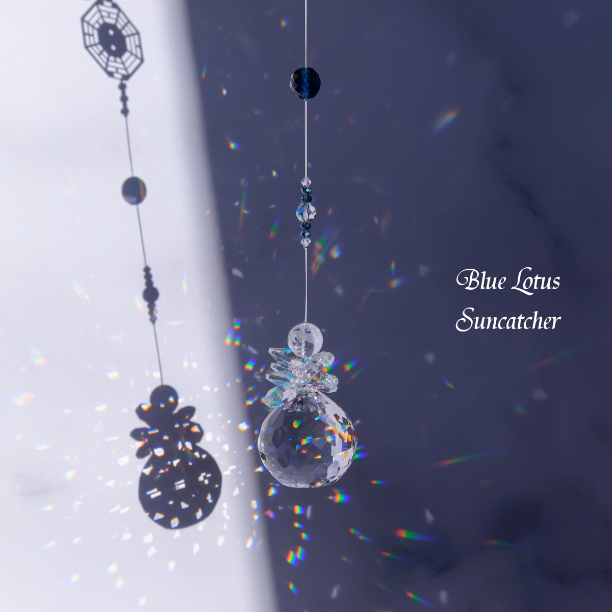 クリスタルガラスの上部には、複数の八角形ガラスと龍の彫りがされた天然水晶も組み込まれており、光にさらされると見事な虹の演出をお楽しみいただけます。