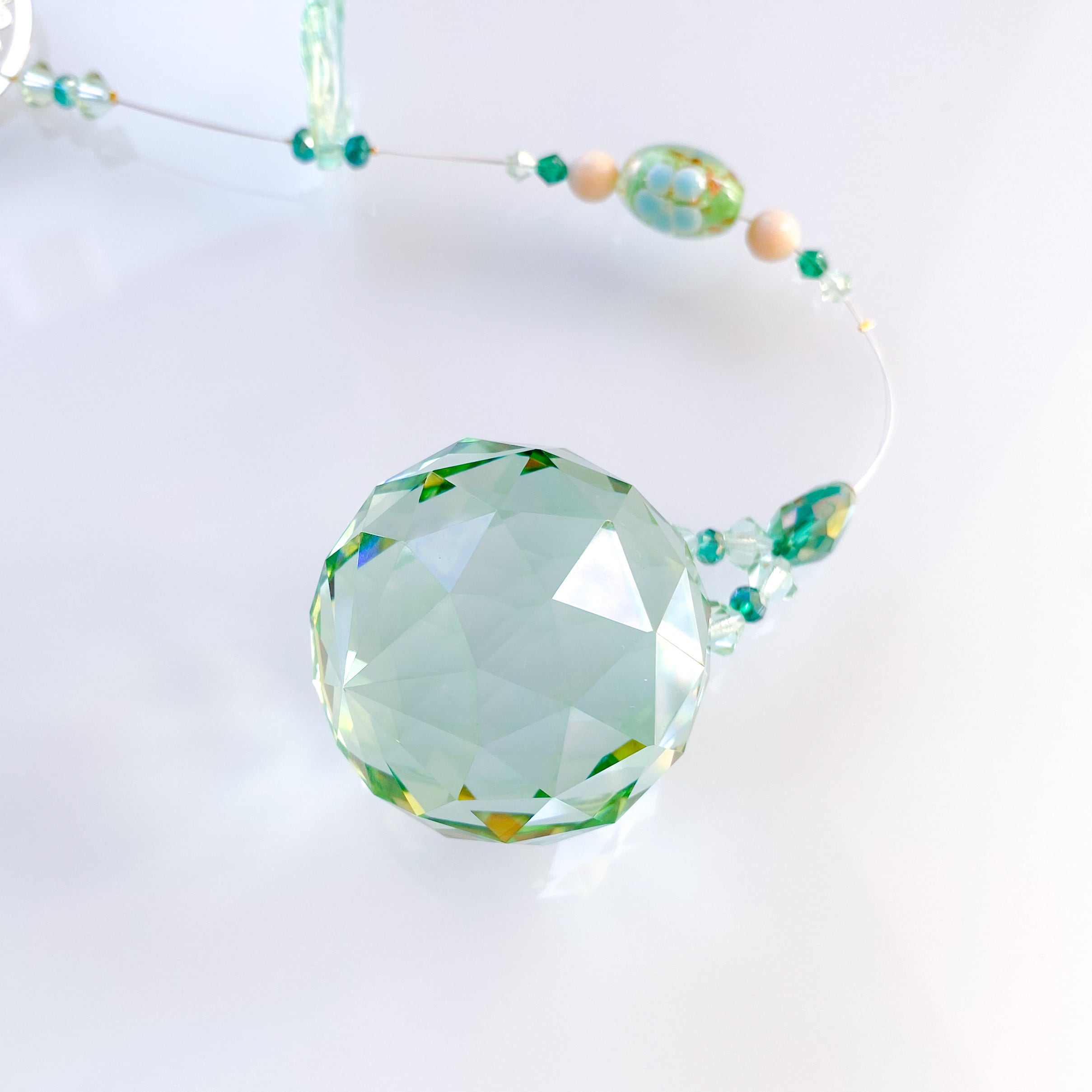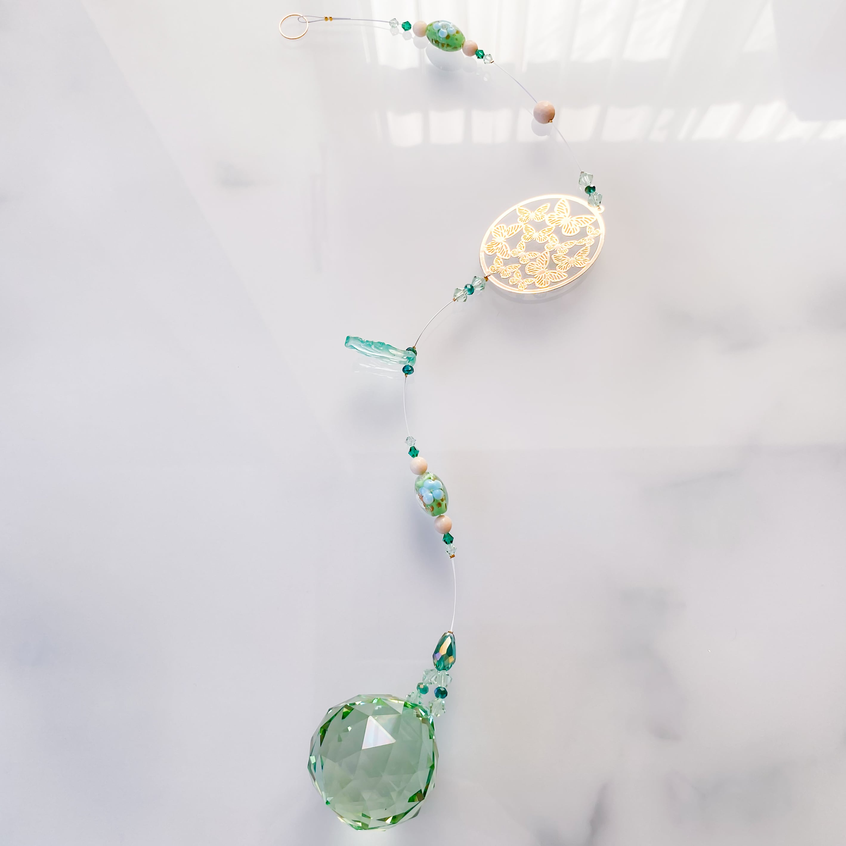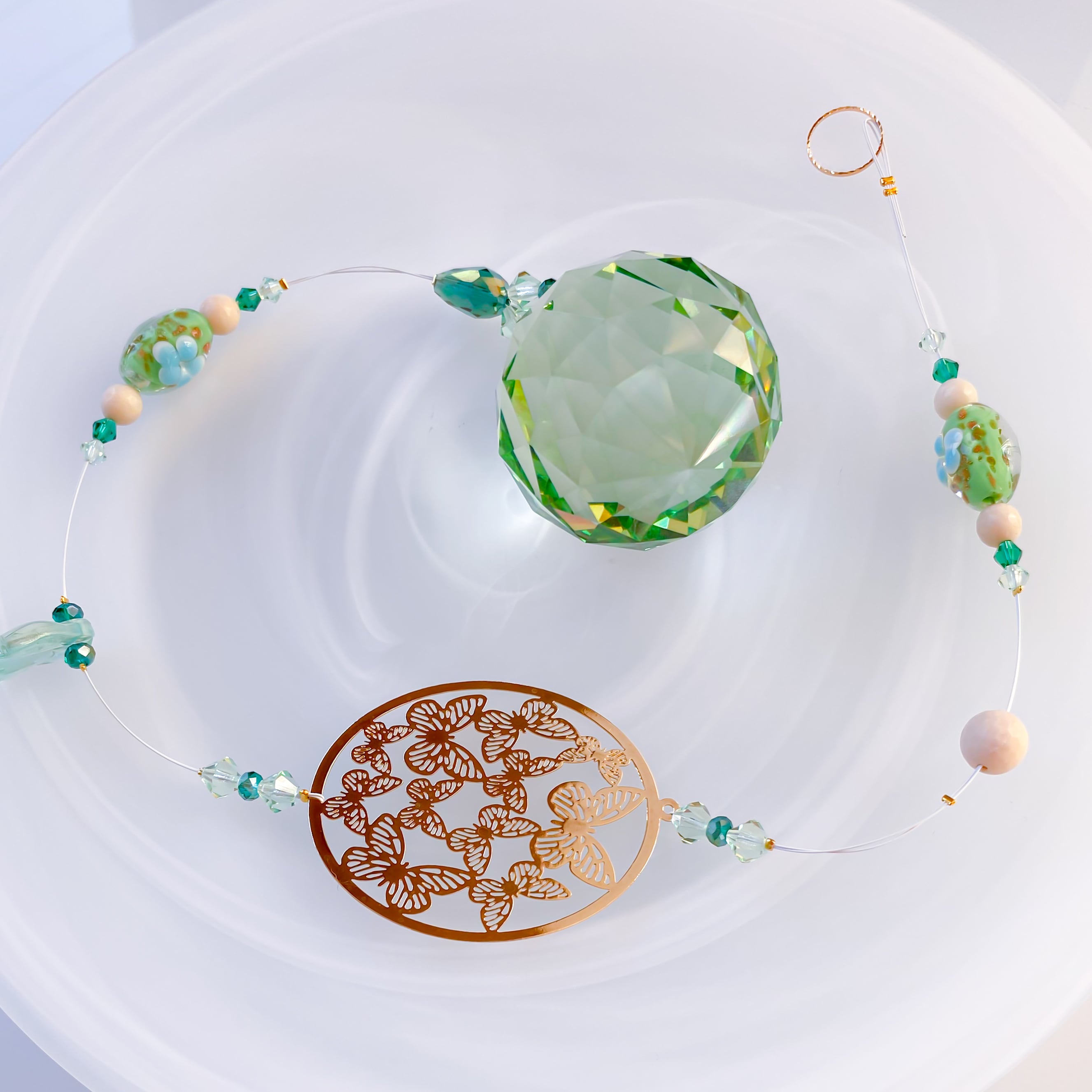 草原を思わせるような瑞々しいグリーンを基調とし、長い年月を経て植物が結晶化したオフホワイトの珪化木(けいかぼく)をアクセントに組み入れたサンキャッチャーです。