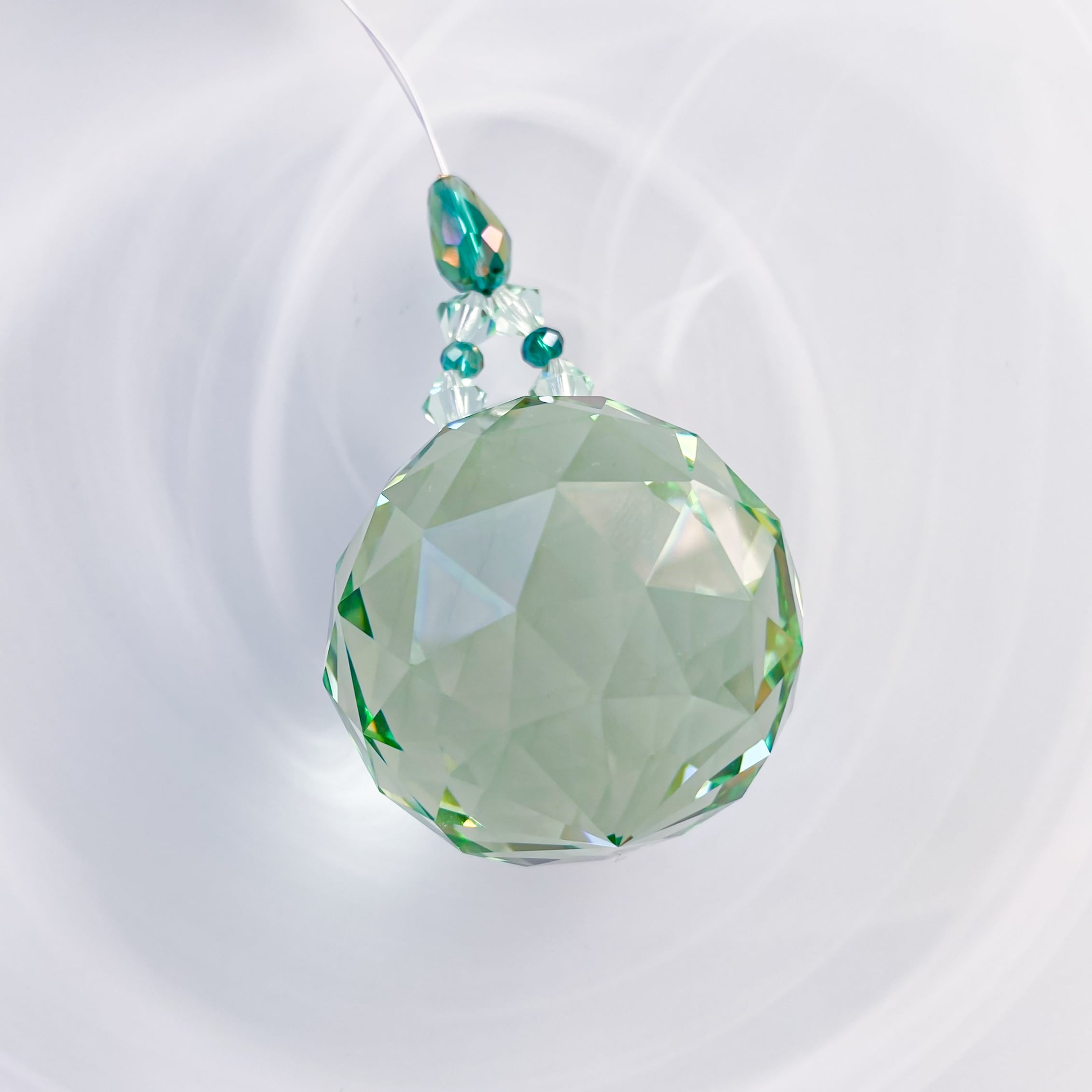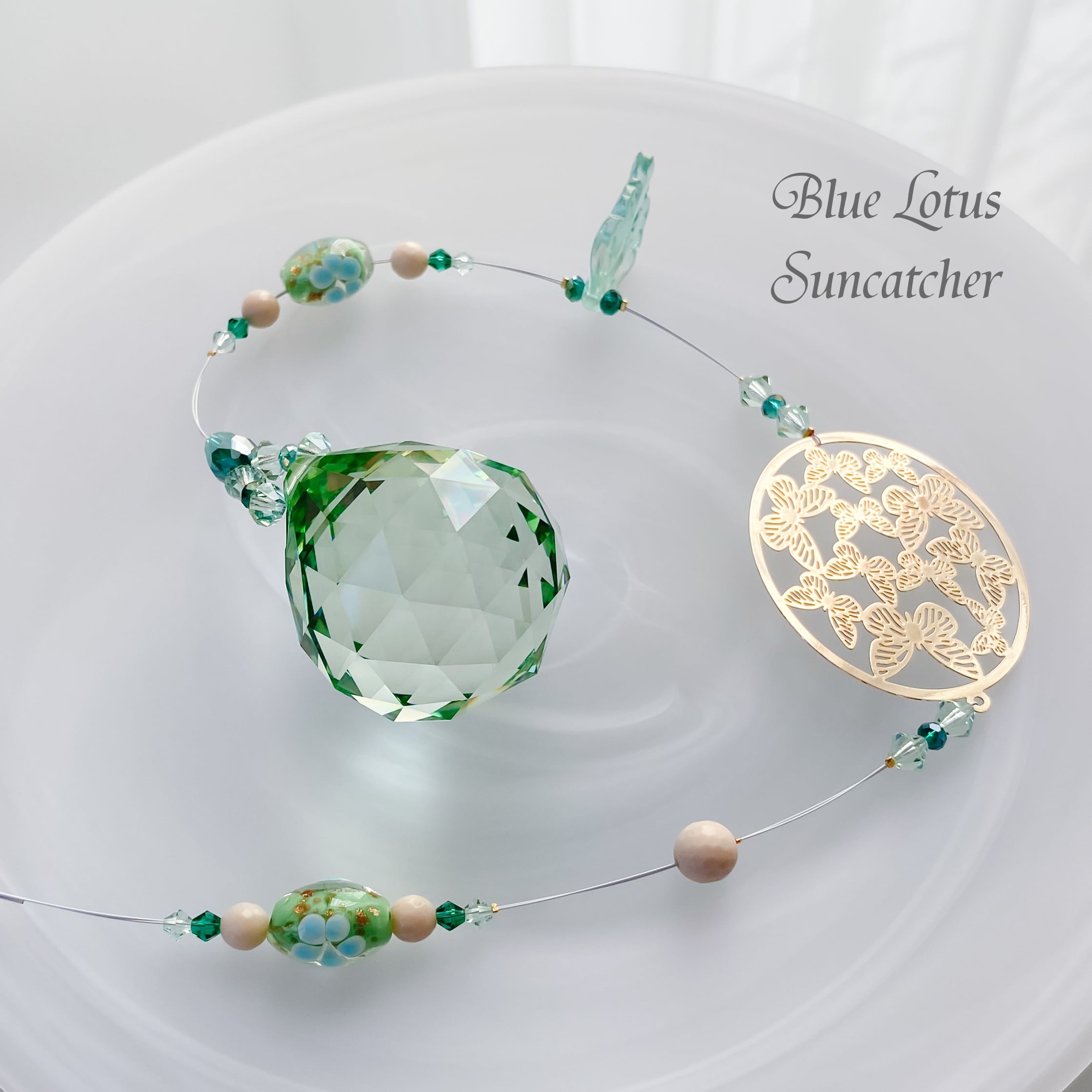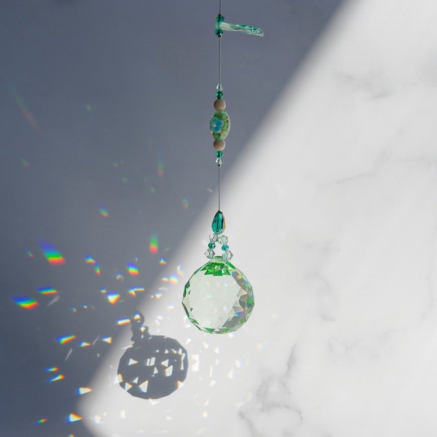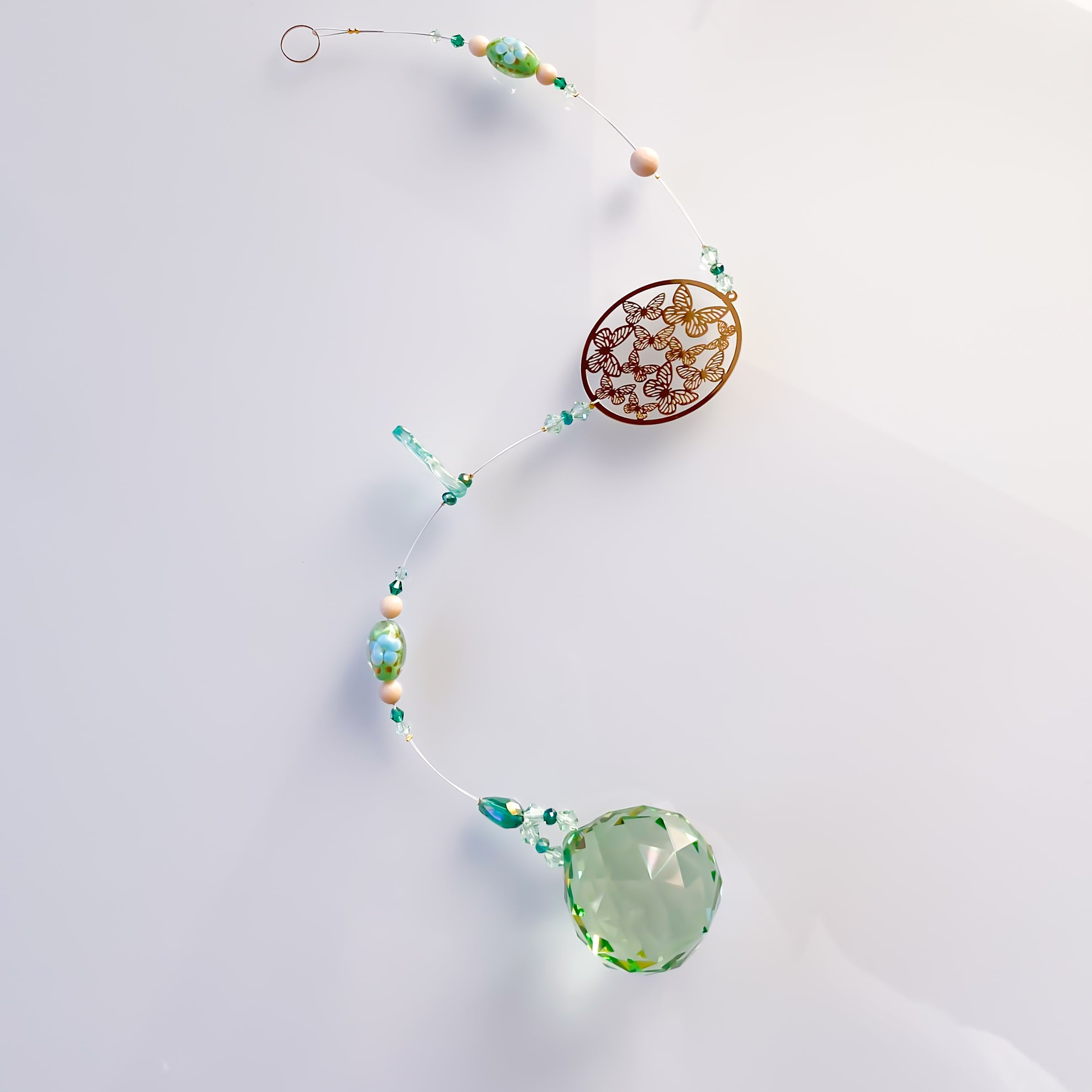 草原を思わせるような瑞々しいグリーンを基調とし、長い年月を経て植物が結晶化したオフホワイトの珪化木(けいかぼく)をアクセントに組み入れたサンキャッチャーです。