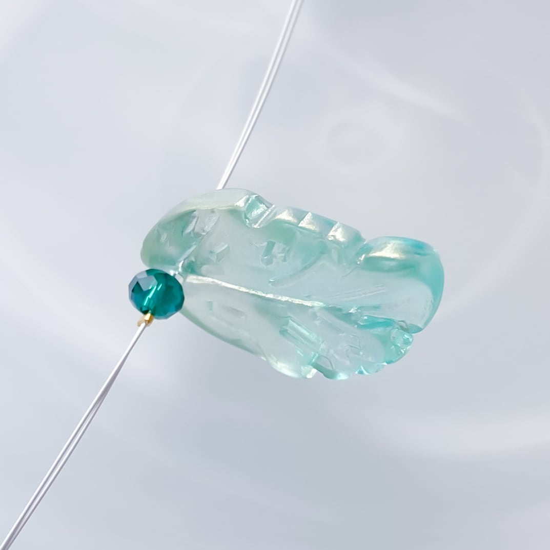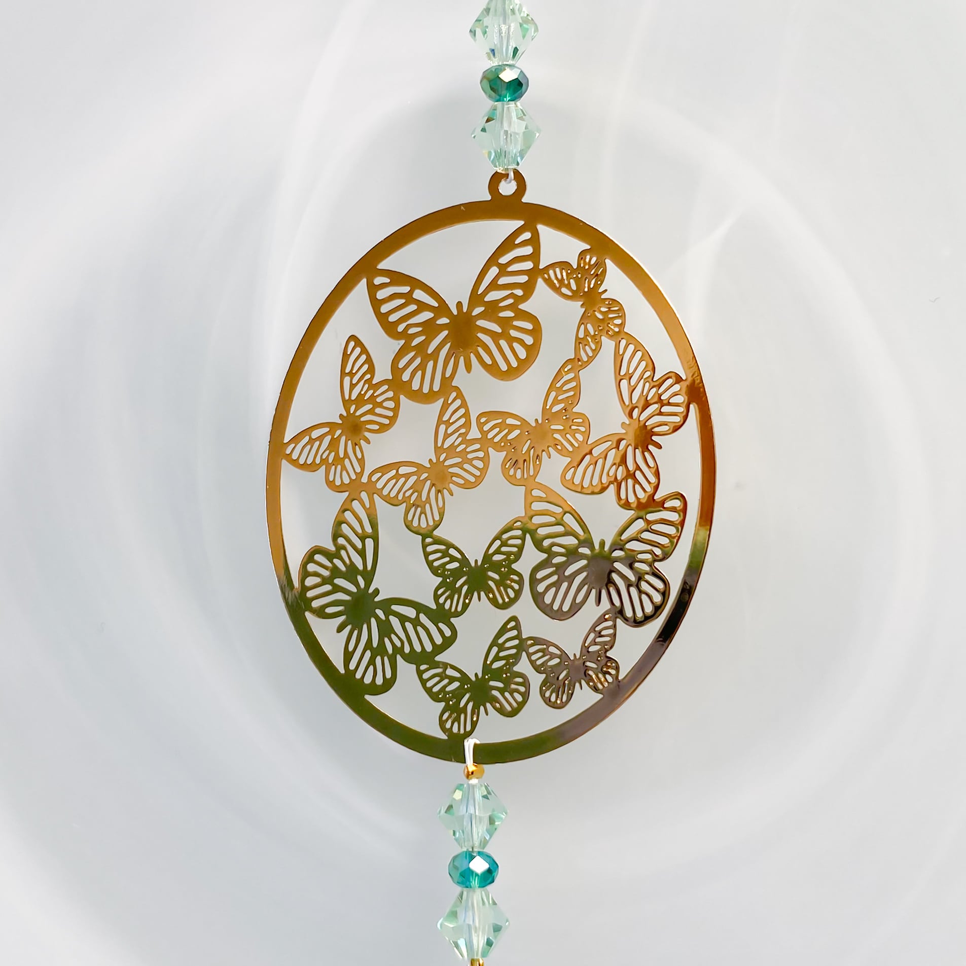蝶が舞うデザインの真鍮製パーツやガラス製の葉っぱ、フラワーモチーフのビーズなどを組み合わせることで、春の大地のエネルギーを感じられるようなナチュラルな雰囲気に仕上げました。