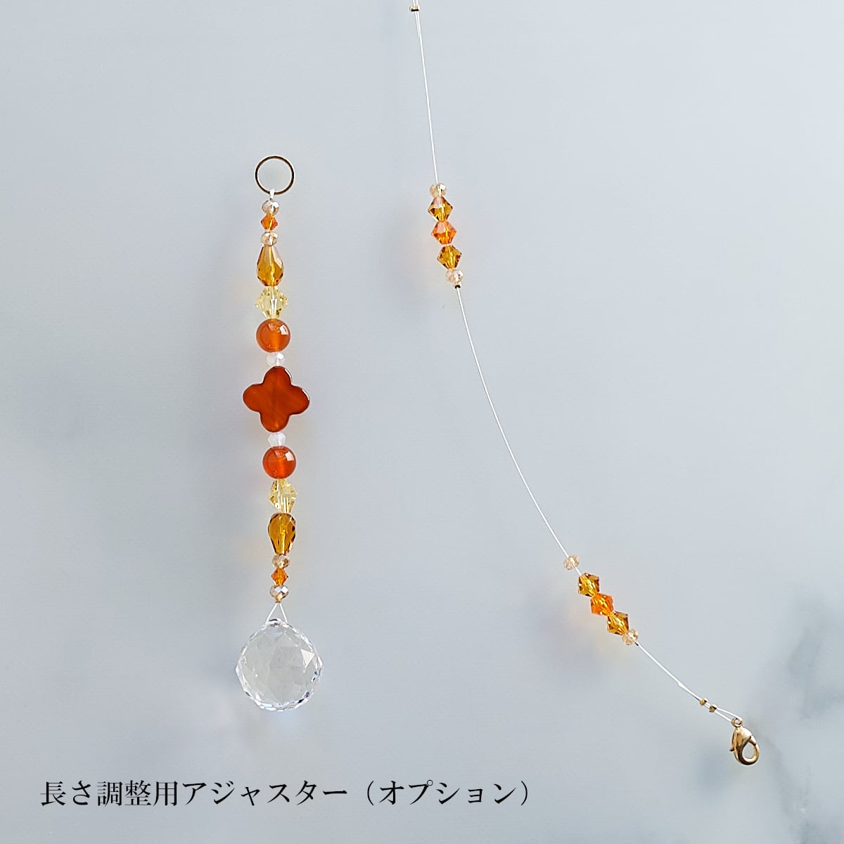 中央部に太陽のような明るさに満ちた元気なエネルギーを持つと言われているパワーストーンのカーネリアン(朱色)を組み入れています。