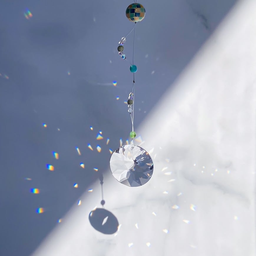 やわらかな光と自然の流れを感じさせる、グリーン&ブルーを基調にしたサンキャッチャー。