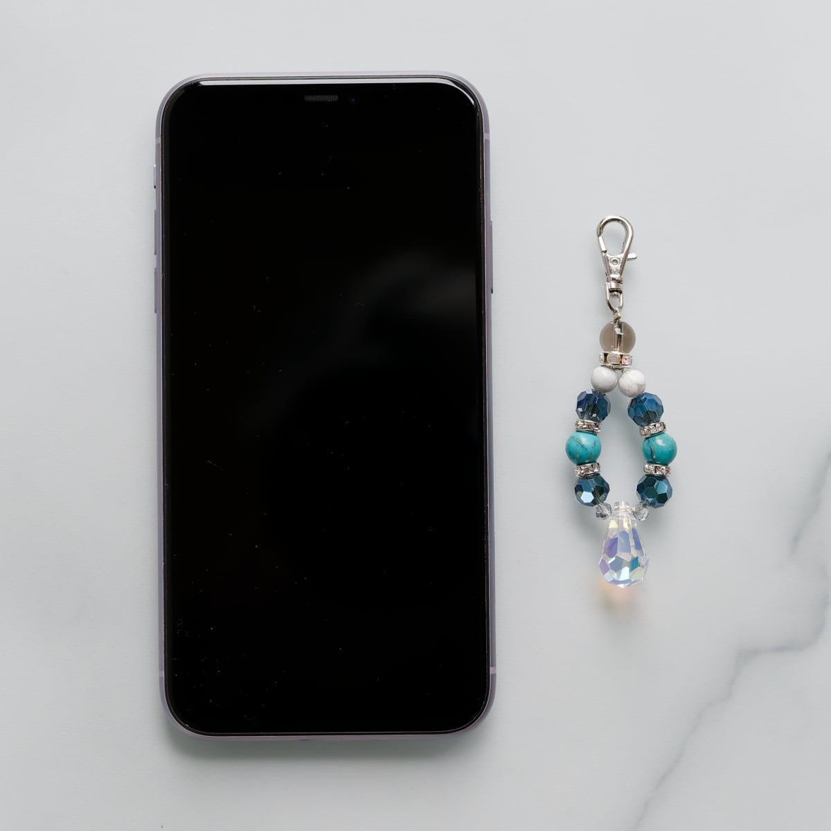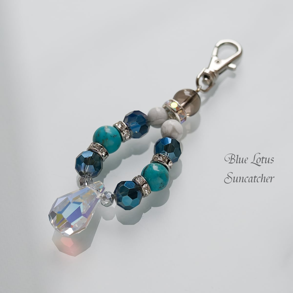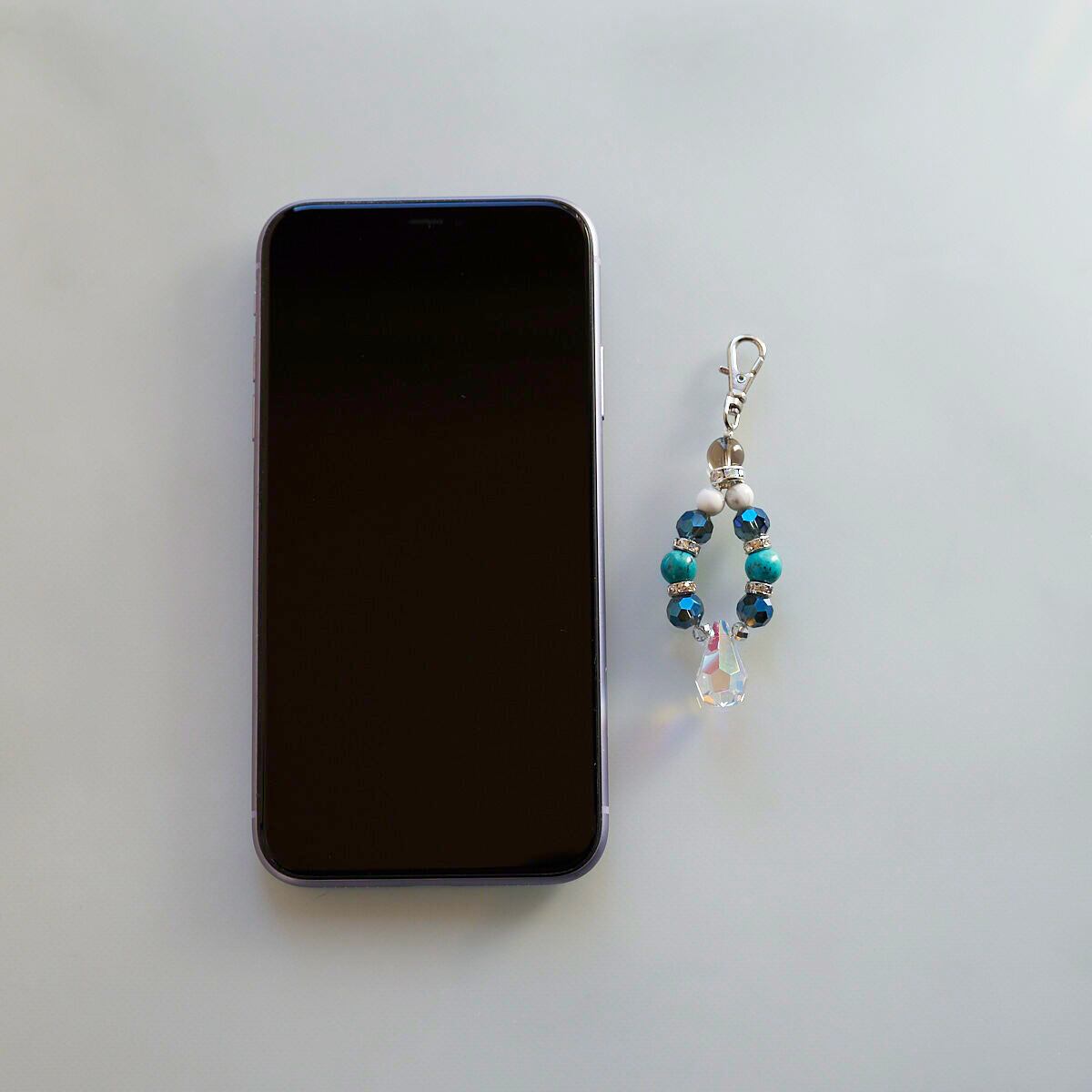 オーロラ加工のティアドロップ型クリスタルを使用し、シルバーのロンデルや天然石を組み入れ、大人っぽく上品な雰囲気のチャームに仕上げました。