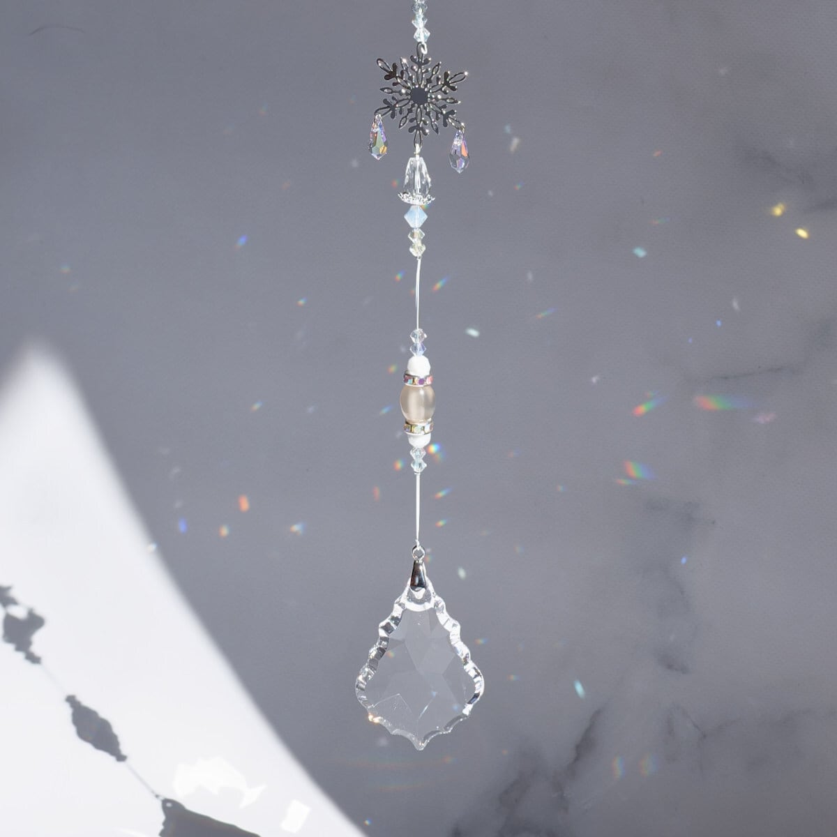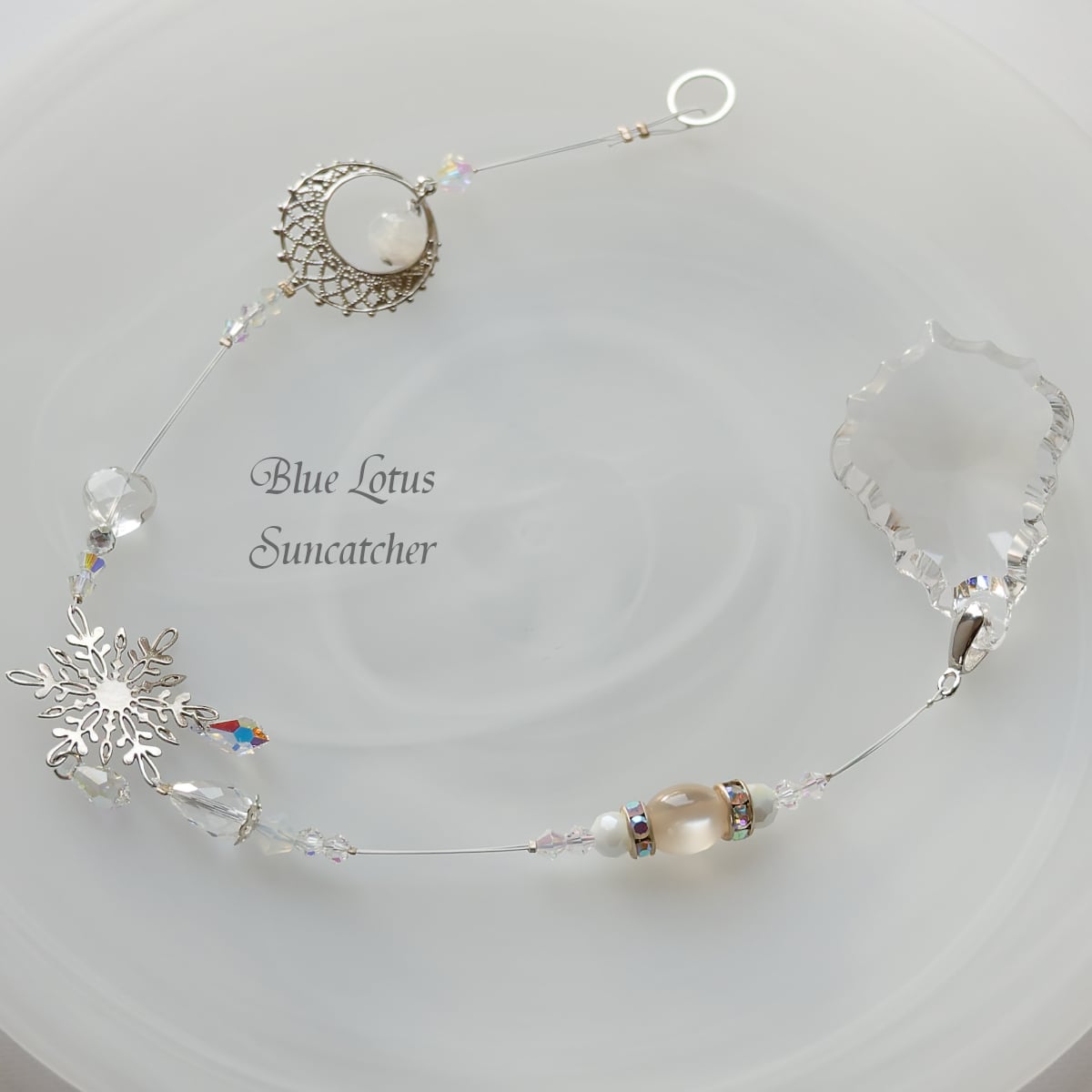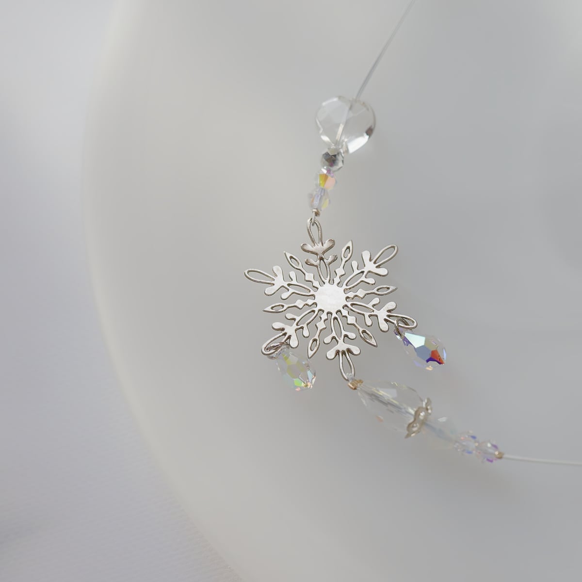 シルバーの雪の結晶モチーフを使い、白銀の美しく神秘的な世界をサンキャッチャーで表現してみました。