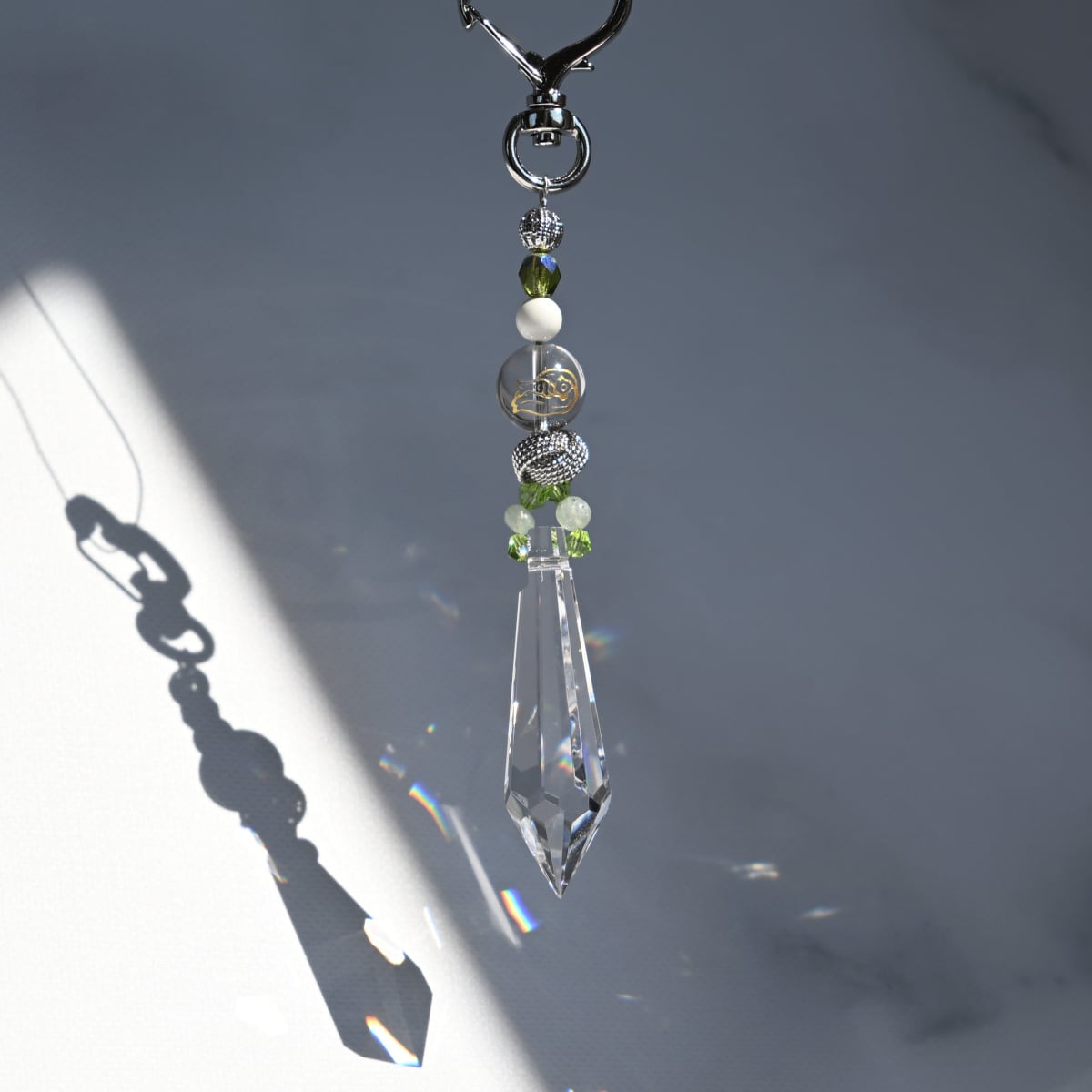 こちらはその「アマビエ」の刻印が入った水晶(直径12mm)を組み入れたサンキャッチャーキーホルダーです。