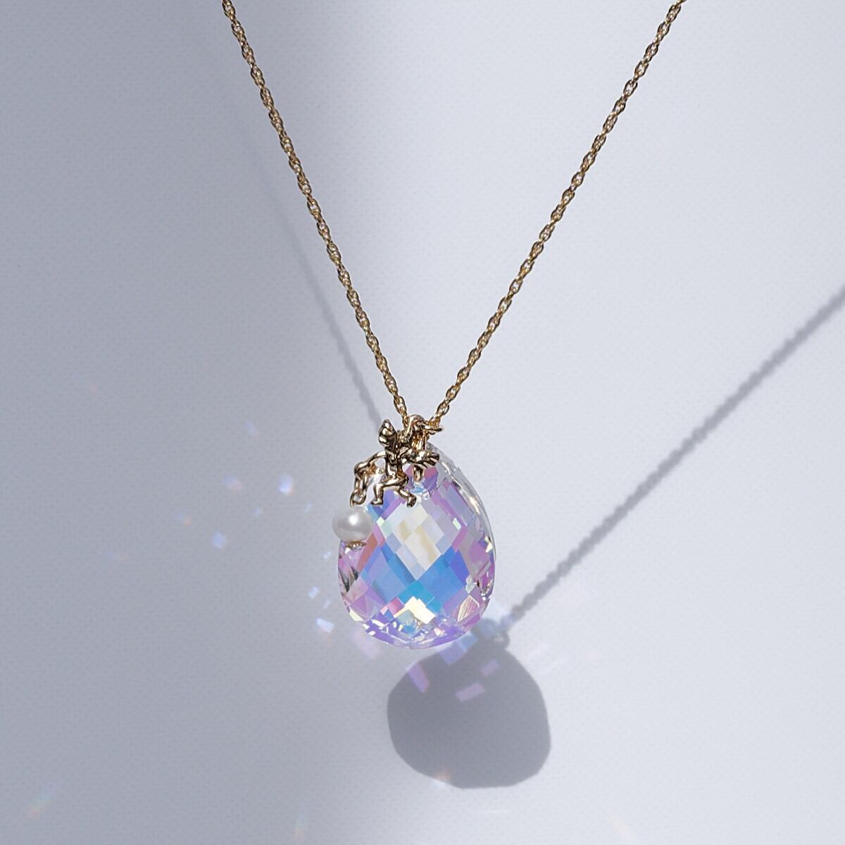 しずく型のクリスタルガラスにゴールドの天使のチャームとパールを組み合わせた上品な雰囲気のネックレスです。