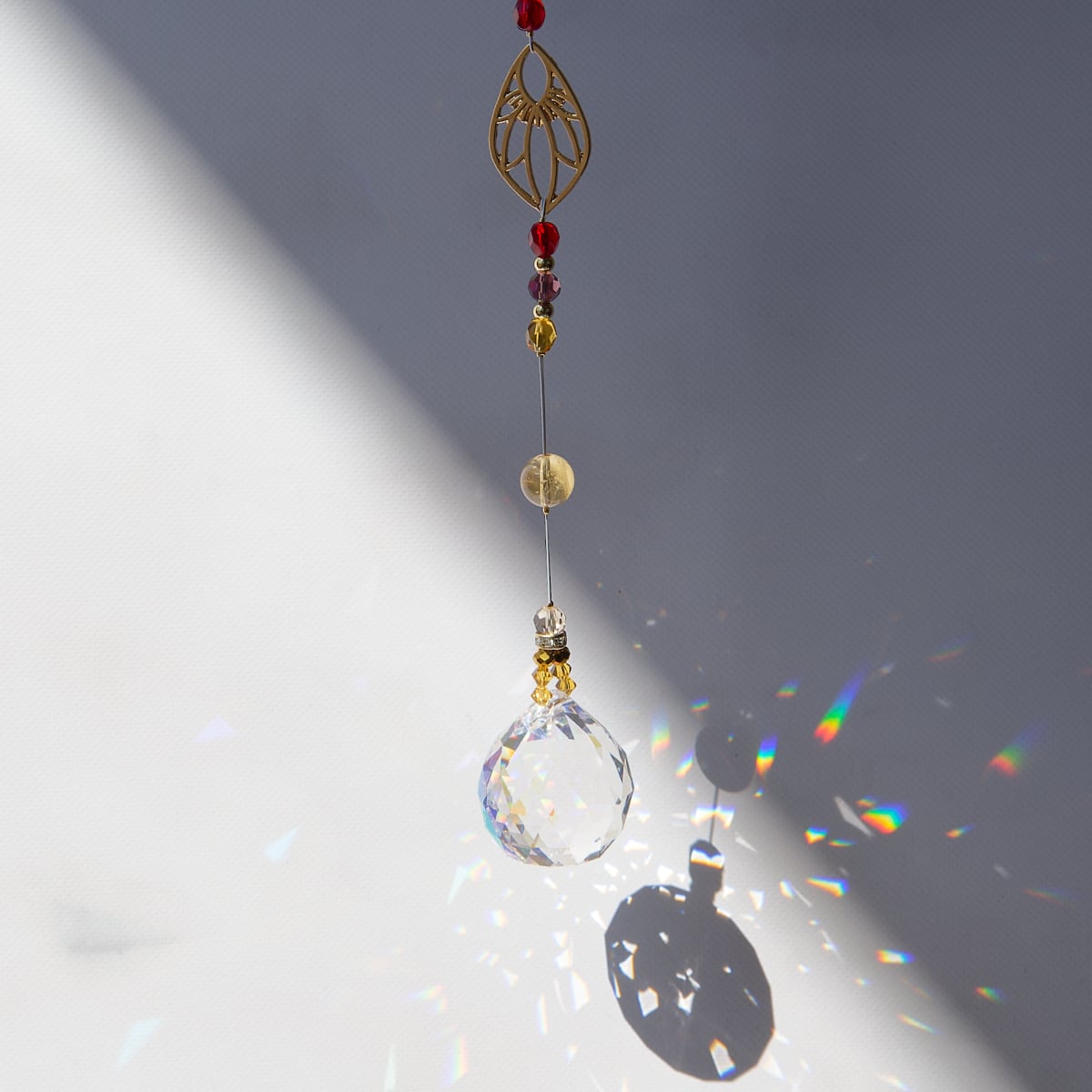 生命力を活性化させ、やる気やモチベーションを高めるとされるカーネリアン(赤)と太陽のようなエネルギーを持つシトリン(黄水晶)を組み入れたサンキャッチャーです。