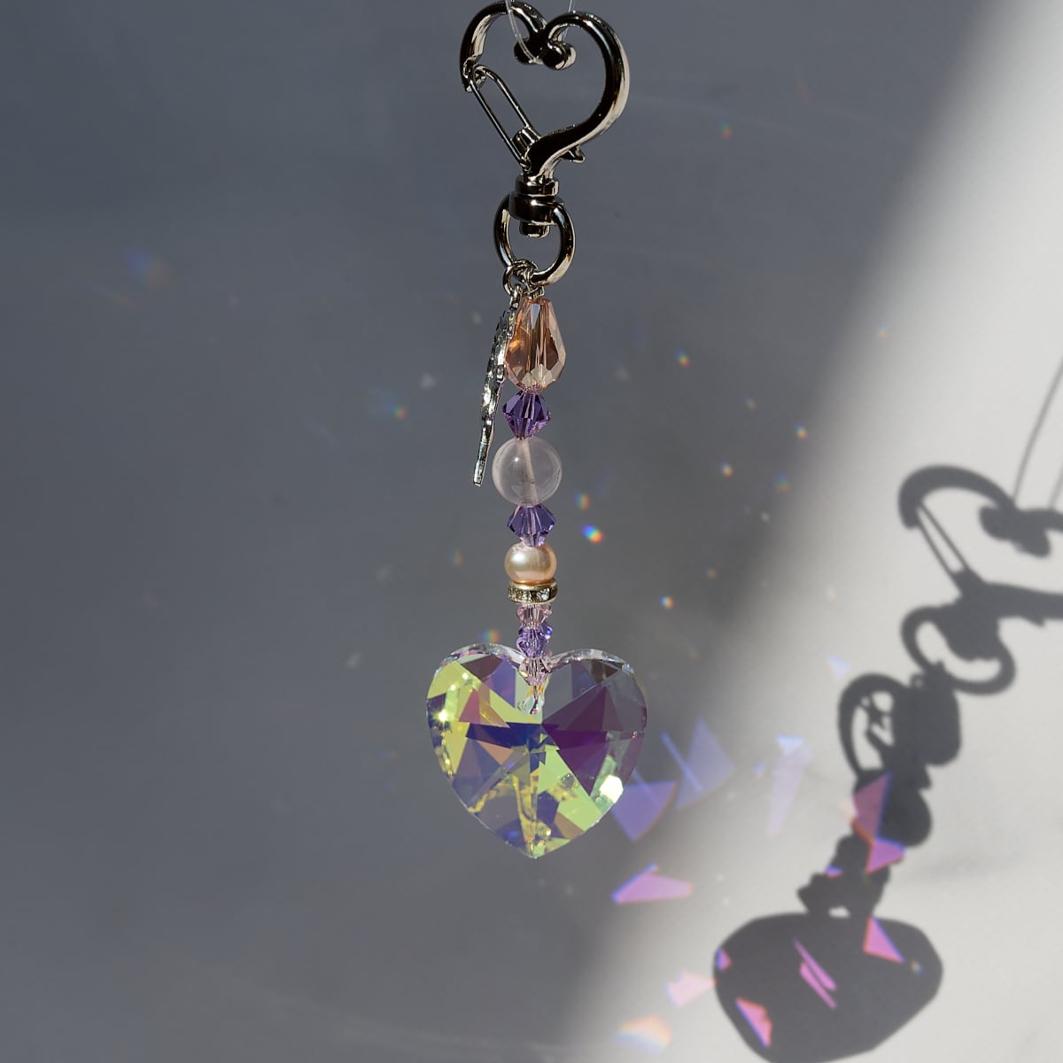 ハートのクリスタルガラスに妖精のチャームがワンポイントになっているパステルカラーの優しい雰囲気のキーホルダー。